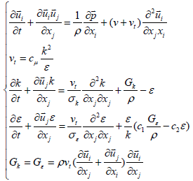擇單相流體的不可壓縮三維粘性流動模型,采用不可壓縮流動的雷諾方程組與k-ε湍流模型構(gòu)成封閉的方程組來描述,如式(1)所示。