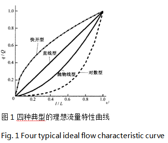 在常見(jiàn)的調(diào)節(jié)閥中,有四種典型的流量特性曲線,即直線型、對(duì)數(shù)型(也稱(chēng)等百分比型)、快開(kāi)型、拋物線型」,分別對(duì)應(yīng)圖1中的曲線1、2、3、4。直線型流量特性的調(diào)節(jié)閥,流量隨行程線性變化,在小開(kāi)度時(shí)流量變化明顯(流量變化量與流量的比值大),調(diào)節(jié)靈敏度高,而在大開(kāi)度時(shí),流量變化相對(duì)緩慢(流量變化量與流量的比值小),調(diào)節(jié)靈敏度低,因而出現(xiàn)大開(kāi)度下調(diào)節(jié)能力不足等問(wèn)題,因此在一些情況下不能滿足調(diào)節(jié)要求。對(duì)數(shù)型流量特性的調(diào)節(jié)閥,流量變化速度逐漸加快,小開(kāi)度時(shí)流量變化緩慢,調(diào)節(jié)精度高,大開(kāi)度時(shí)流量變化相對(duì)較快,能保持良好的調(diào)節(jié)能力,這些特點(diǎn)使其在工程中得到了廣泛的應(yīng)用。拋物線型調(diào)節(jié)閥的調(diào)節(jié)特性介于直線型和對(duì)數(shù)型兩者之間田,這種特性的調(diào)節(jié)閥在工程應(yīng)用中也比較常見(jiàn)。快開(kāi)型調(diào)節(jié)閥的調(diào)節(jié)特點(diǎn)與對(duì)數(shù)型相反,小開(kāi)度時(shí)流量迅速變化,達(dá)到快速加大流量的目的,而大開(kāi)度時(shí)流量變化緩慢。除了這四種典型曲線外,還有雙曲線型、平方根型等流量特性曲線,但并不常見(jiàn)。