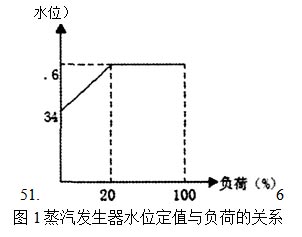 主給水泵的打出來(lái)的水經(jīng)過(guò)高壓加熱器后進(jìn)人一條給水母管,再由此分為兩條給水管路,通往兩臺(tái)蒸發(fā)器。每個(gè)給水調(diào)節(jié)站包括一個(gè)主給水調(diào)節(jié)閥和一個(gè)旁路調(diào)節(jié)閥,在主調(diào)節(jié)閥前后設(shè)電動(dòng)隔離閥,每臺(tái)蒸汽發(fā)生器裝有一個(gè)水位控制器,用于使蒸汽發(fā)生器保持一個(gè)隨負(fù)荷變化的預(yù)定水位。并聯(lián)安裝的主、旁路調(diào)節(jié)閥進(jìn)行給水流量調(diào)節(jié),以調(diào)節(jié)蒸發(fā)器的水位。主給水調(diào)節(jié)閥可保證1854t/h的流量(名義流量的 95%),旁路調(diào)節(jié)閥可保證的流量為293(名義流量的巧%)。當(dāng)負(fù)荷小于18.5%Pn時(shí),旁路調(diào)節(jié)閥獨(dú)自控制;當(dāng)負(fù)荷在1 &5%pn到100% pn之間時(shí),主給水調(diào)節(jié)閥和旁路調(diào)節(jié)閥都參與SG水位控制,此時(shí),旁路調(diào)節(jié)閥保持全開(kāi)狀態(tài)。主給水調(diào)節(jié)閥和旁路調(diào)節(jié)閥可用電動(dòng)閥從上游和下游進(jìn)行隔離。 圖1給出了蒸汽發(fā)生器水位定值與負(fù)荷的關(guān)系。在(蒸汽)負(fù)荷小于20%pn時(shí),程序水位線性的從34%(零負(fù)荷時(shí))變化到5L6%(在 20%pn時(shí))。在負(fù)荷大于20%Pn時(shí),程序水位是恒定的,并設(shè)定為窄量程水位的5L6%。