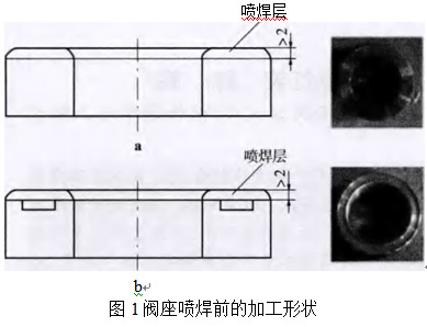 為了避免等離子弧高加熱速度和溫度產(chǎn)生的涂層剝落破壞的開(kāi)裂、飛濺、滴流及其他不良影響,在任何加工形式時(shí)應(yīng)仔細(xì)選擇噴涂規(guī)范。等離子弧噴焊時(shí)的工藝參數(shù)如表1所示。等離子噴涂噴槍的功率40 kw,送粉方式為槍外送粉。另外,噴嘴到工件距離為1儺巧mm,工作臺(tái)轉(zhuǎn)速10、巧r/min等離子弧噴焊時(shí)和噴焊后的閥座外觀如圖2所示。