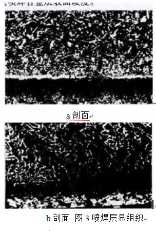 由圖3a可知,結(jié)合層由兩部分組成,即上方的噴焊合金層和下方的母材熱影響區(qū)層。合金層組織主要呈枝晶生長(zhǎng)狀態(tài),且枝晶細(xì)小;從圖3b可看出