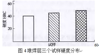 三個(gè)試樣硬度分析結(jié)果如圖4所示。由于鎳基堆焊合金層存在較高的cr,會(huì)形成更多化合物相,且其組織細(xì)小均勻,硬度較高,滿(mǎn)足耐磨性的要求。