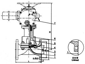 部件列表:1.閥體 2.閥體襯里 3.隔膜 4.閥瓣 5.閥桿 6.閥蓋 7、電動(dòng)頭